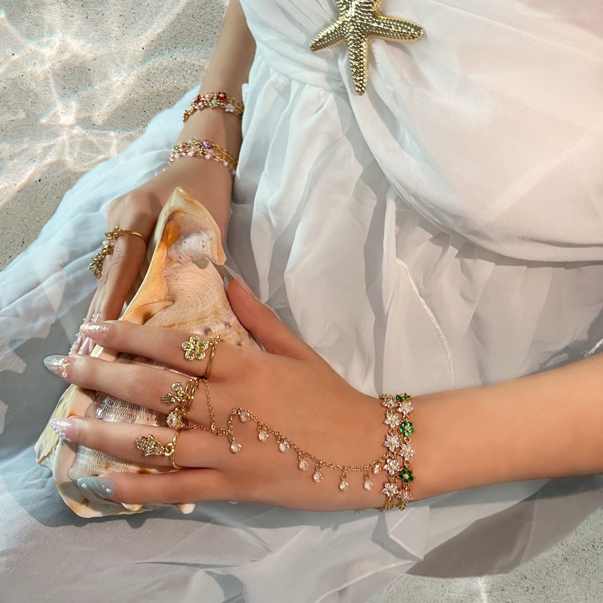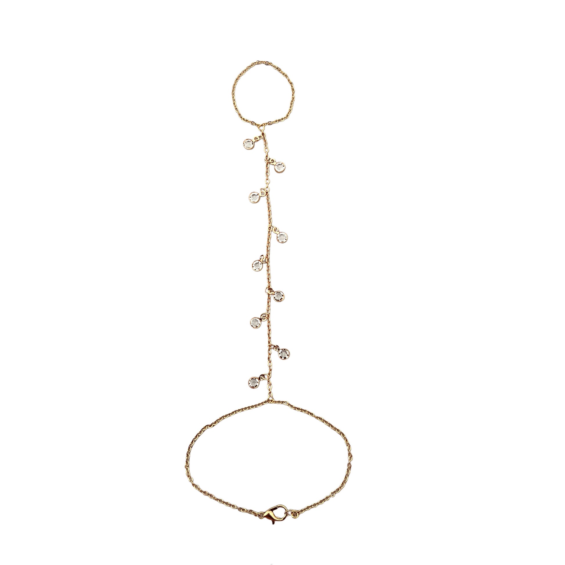 Cette chaîne de main allie un design épuré et minimaliste à des détails subtils et chatoyants. Confectionnée en acier inoxydable anti-ternissement et ornée d'un maillon boule en or poli, elle est ornée de breloques pendantes en oxyde de zirconium micro-pavé plaqué or 18 carats et d'un connecteur en cristal plaqué or 14 carats, créant une touche subtile et élégante.