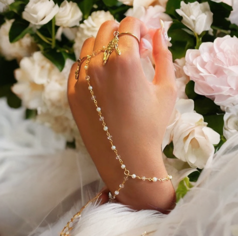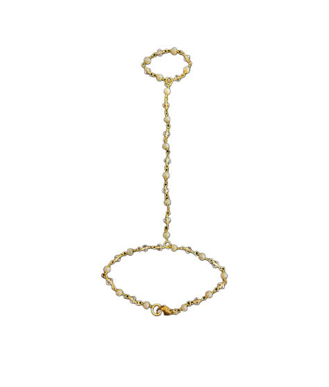Sublimez votre look avec cette chaîne de main raffinée en perles et cristaux, confectionnée à partir de perles de cristal. Conçue avec un mouvement fluide et des détails lumineux, elle épouse la main avec aisance : délicate, sculpturale et discrètement saisissante.