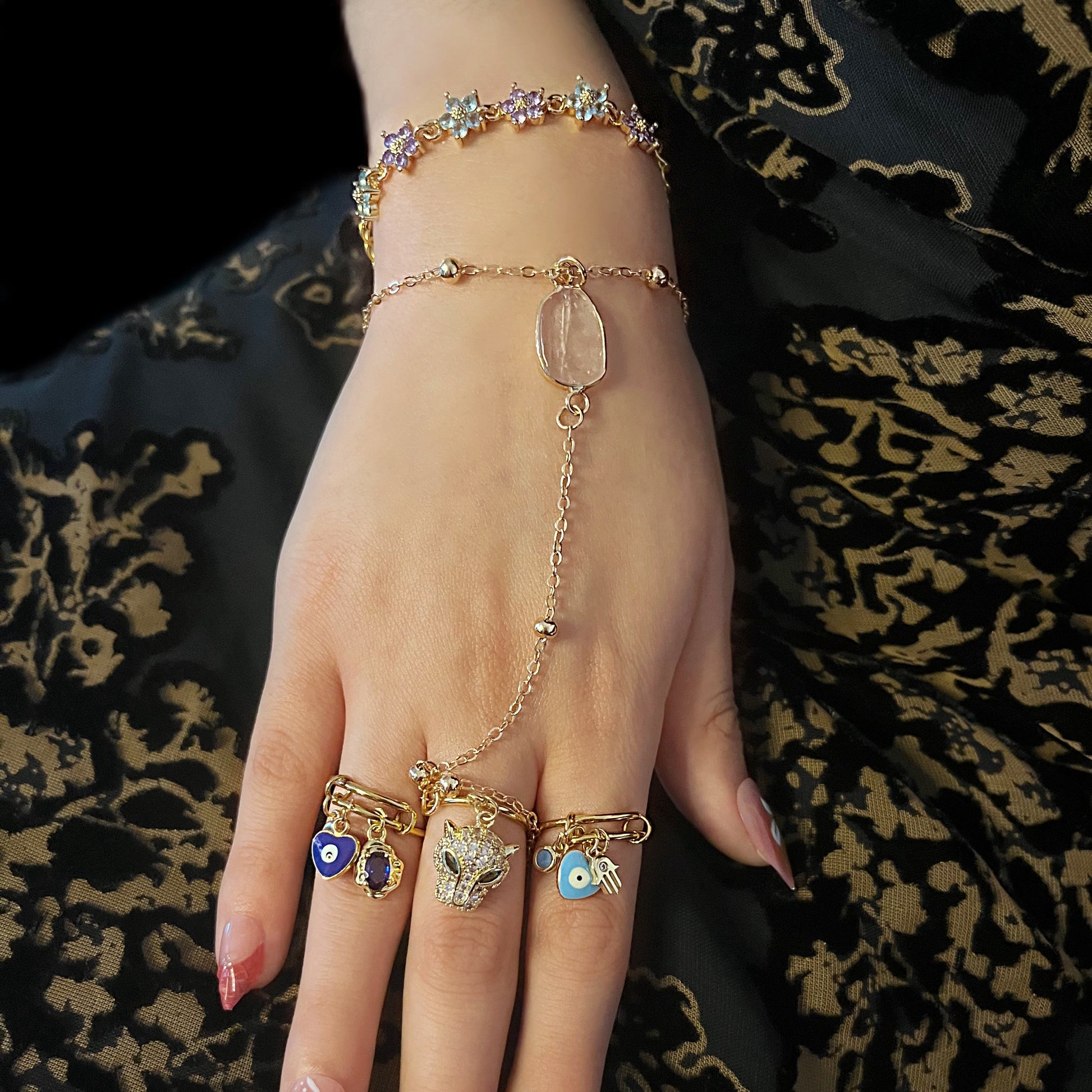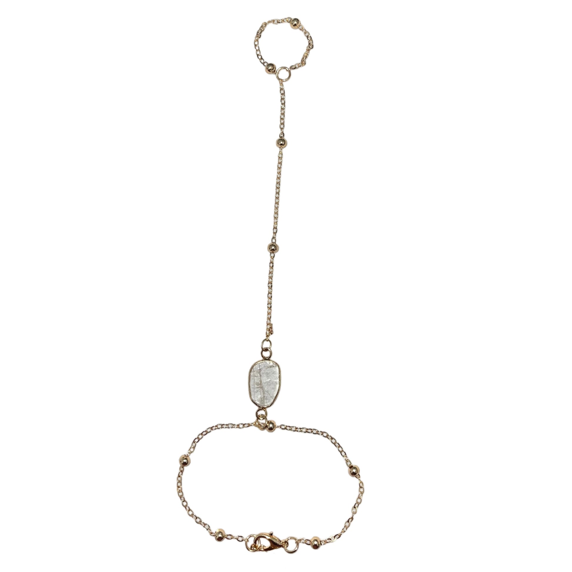 Le Solaris Wrap , sublimé. Cette chaîne de main allie un design épuré et minimaliste à des détails subtils et chatoyants. Confectionnée en acier inoxydable anti-ternissement et ornée d'un maillon boule en or poli, elle est ornée de breloques pendantes en oxyde de zirconium micro-pavé plaqué or 18 carats et d'un connecteur en cristal plaqué or 14 carats, créant une touche subtile et élégante.