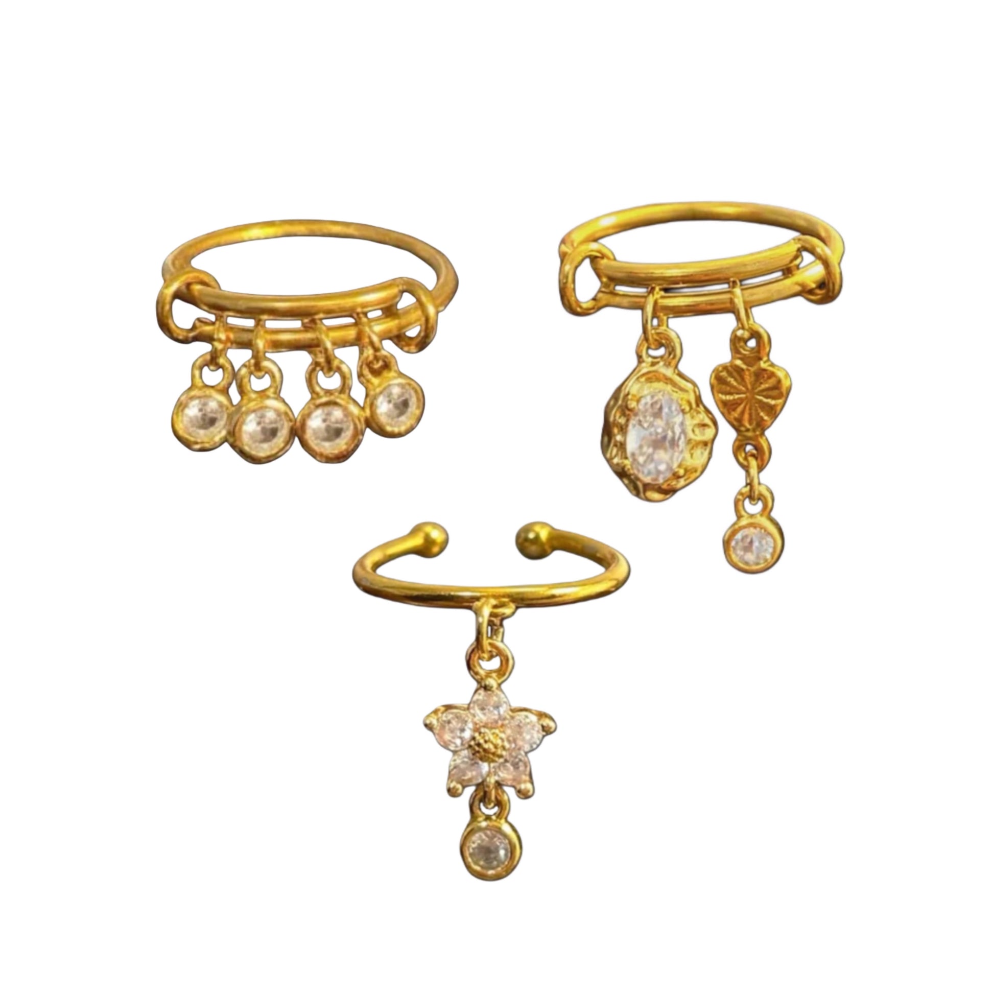 Cette pile de bagues rassemble trois de nos bagues pendantes de luxe, chacune accentuรฉe de pierres prรฉcieuses dorรฉes et blanches pour se complรฉter lorsqu'elles sont superposรฉes.ย