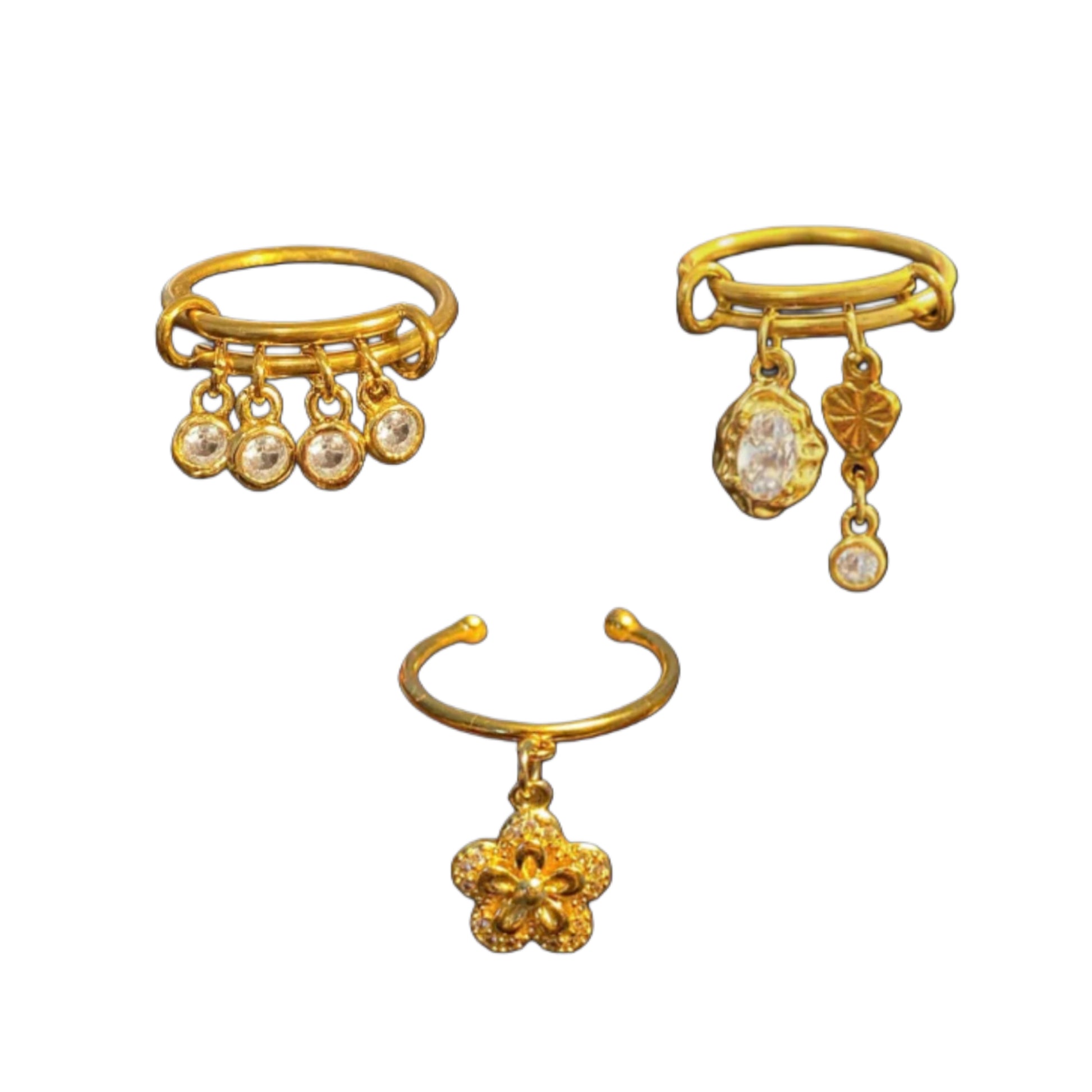 Ce pack รฉconomique rassemble trois de nos exquises bagues pendantes, chacune accentuรฉe de pierres prรฉcieuses dorรฉes et blanches pour se complรฉter lorsqu'elles sont superposรฉes.ย